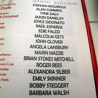 Lamond and I (tt) were privileged to sit in the fifth row of the Longacre to be part of the audience for a benefit honouring Mr McNally's magnificent career. Written and presented by John Doyle it was introduced by Angela Lansbury, oozing class despite having dragged herself from her sick bed. A feast of songs, anecdotes and excerpts from his work were presented by the following artistes
