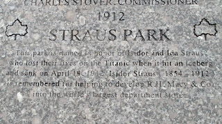 It is the very building we were having burgers and coffee in! This was probably taken in the sixties.This lovely statue reclines in Straus Park up near the intersection of West End Ave and Broadway. She is eternally pondering the fate of the Straus's, who were sailing home from a Continental jaunt. He was one of the power figures behind Macy's department store. She was his devoted wife of many years. When their chosen vessel, Titanic, foundered in the Atlantic on the evening of the 15th of April,1912, they both went down.
